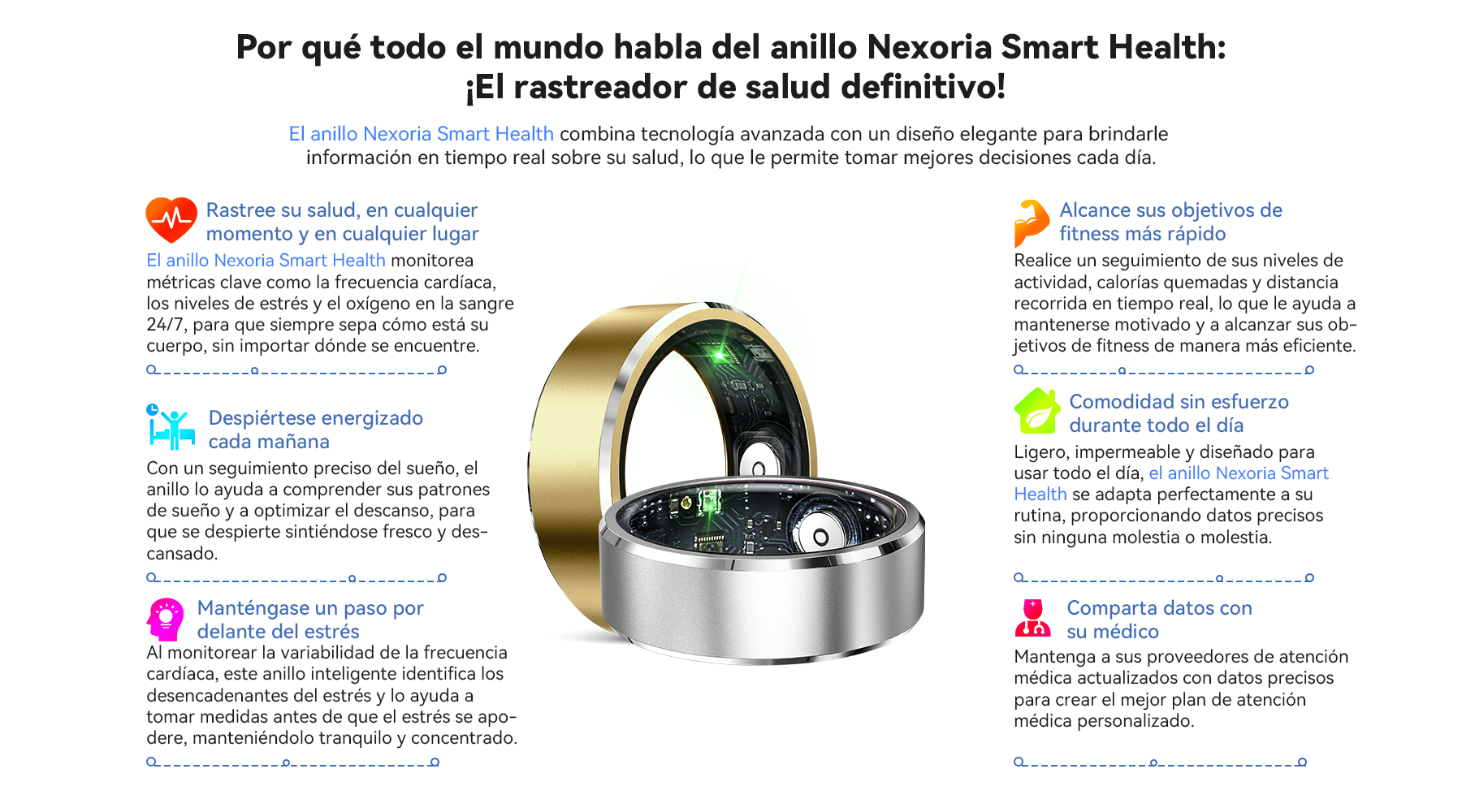 La historia de Nexoria nace cuando Alan Smith vio a su abuela luchando con complejas tecnologías de salud. Esto lo inspiró a crear un anillo inteligente pensado para ella. Movido por su visión, Alan diseñó un anillo capaz de monitorear fácilmente el ritmo cardíaco, el sueño y la actividad. Después de numerosas pruebas con personas mayores, lo perfeccionó hasta que sus notificaciones suaves y datos comprensibles les dieron serenidad. Hoy Nexoria está convencida de que la tecnología debe hacer la salud accesible para todos. Elige Nexoria por tecnología con alma humana—primero la empatía, después las funciones.